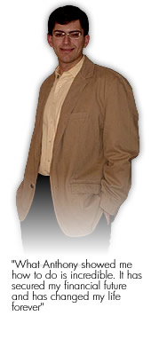I have made over $50,000 a month some months. I am on pace to make over $500,000.00 this year. Like I said, this system, and what Anthony taught me, has really changed my life, as well as the people around me. Last year in 2006 I generated right around $300,000.00, and I never went to work! I was able to do this right from my home PC.